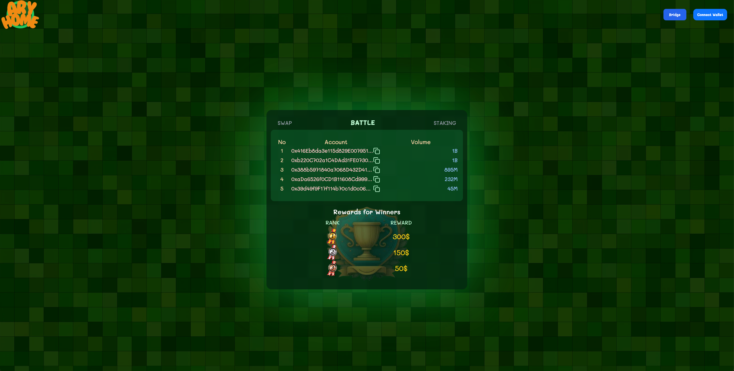 Unlike typical decentralized exchanges, AryHome is tailored specifically for the $ARY community rather than aiming to be an aggregator or multi-token DEX. By focusing solely on $ARY-related tokens, AryHome provides a community-focused, simplified trading experience. The dApp’s primary mission is to foster engagement by tracking volume on the platform and encouraging participation through monthly ranking rewards, known as the “Battle.”