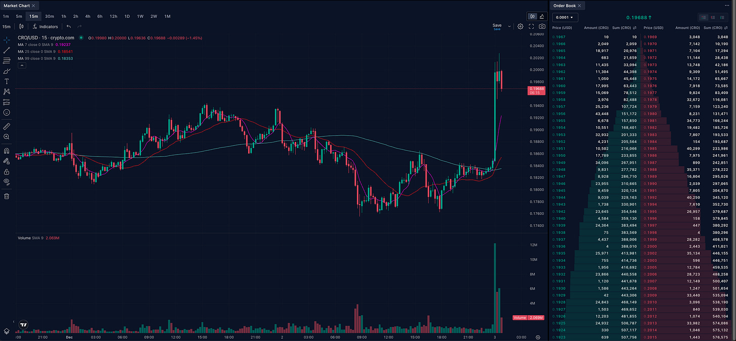 CRO, the native cryptocurrency of the Cronos chain and Crypto.com ecosystem, witnessed a dramatic spike at midnight UTC on December 3, 2024. This surge catapulted the token to test the critical $0.2 resistance level. Trading activity exploded, with a staggering $12.228 million volume recorded on a single 15-minute candle on the Crypto.com Exchange.