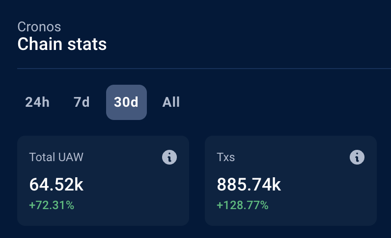 Unique Active Wallets (UAW): A total of 64.52K wallets interacted with Cronos in the last 30 days, marking a 72.31% increase compared to the previous period.