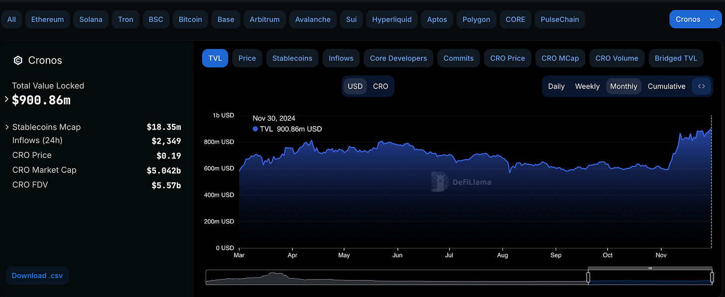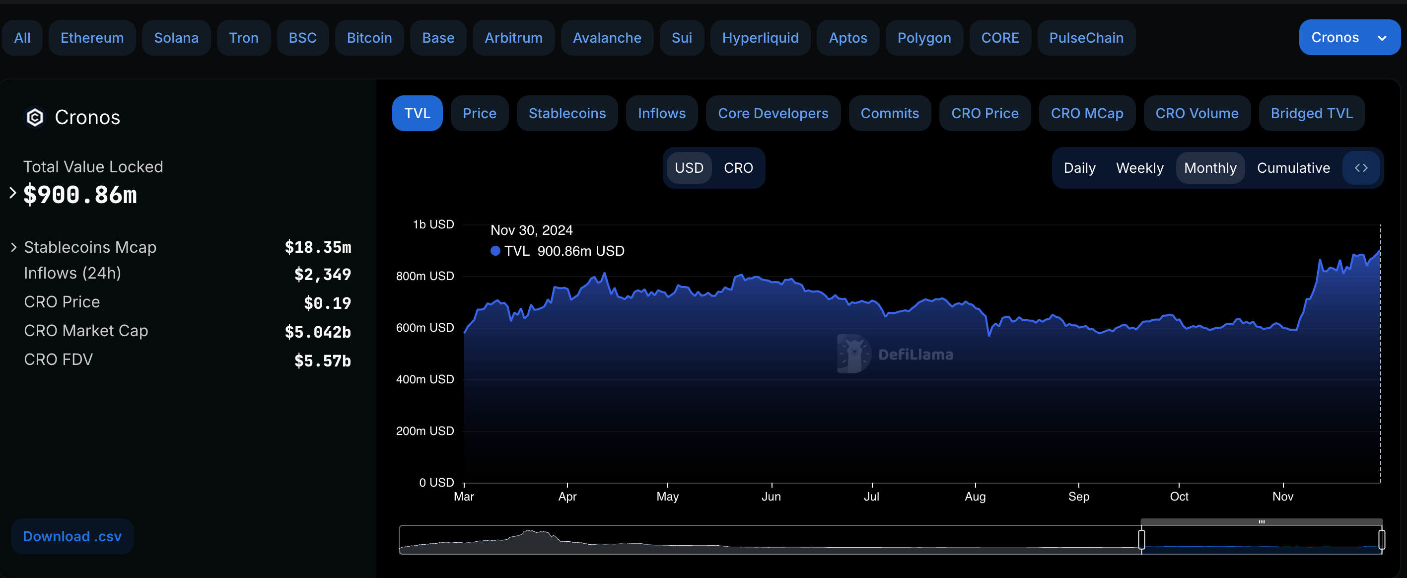 The Cronos ecosystem is regaining its footing in the competitive blockchain space, with today's $900M USD TVL milestone standing as a testament to its resilience. As the network pushes forward, it remains a key player to watch in the DeFi and NFT sectors.