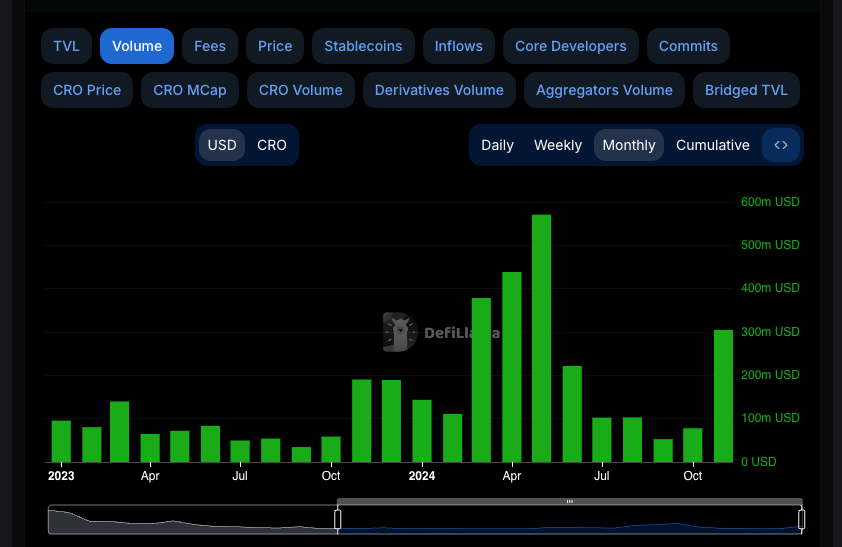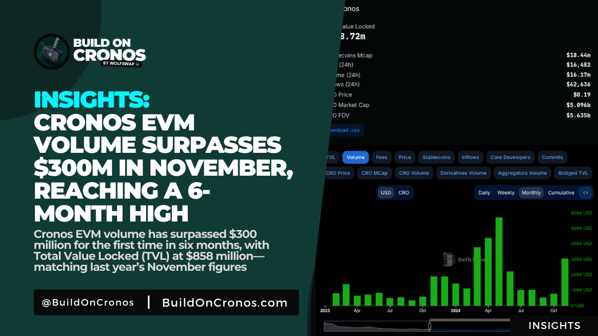 Cronos EVM volume surpasses $300 million in November 2024, the first time since May 2024.