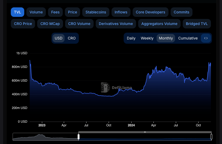 The TVL of $858 million, which reflects the total capital locked in DeFi projects on Cronos, mirrors the network's status one year ago. This consistency suggests that the ecosystem continues to be a reliable hub for decentralized finance (DeFi) and other blockchain applications while reflecting global cryptocurrency interest and price increases in CRO.