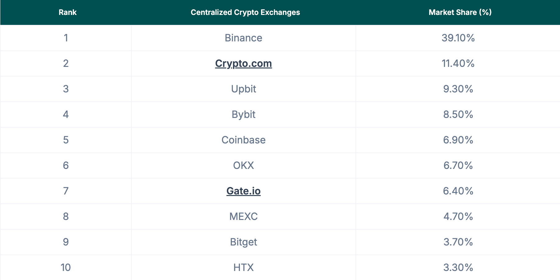 Binance maintains the top position with a 39.1% market share.