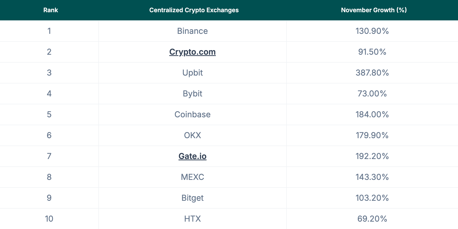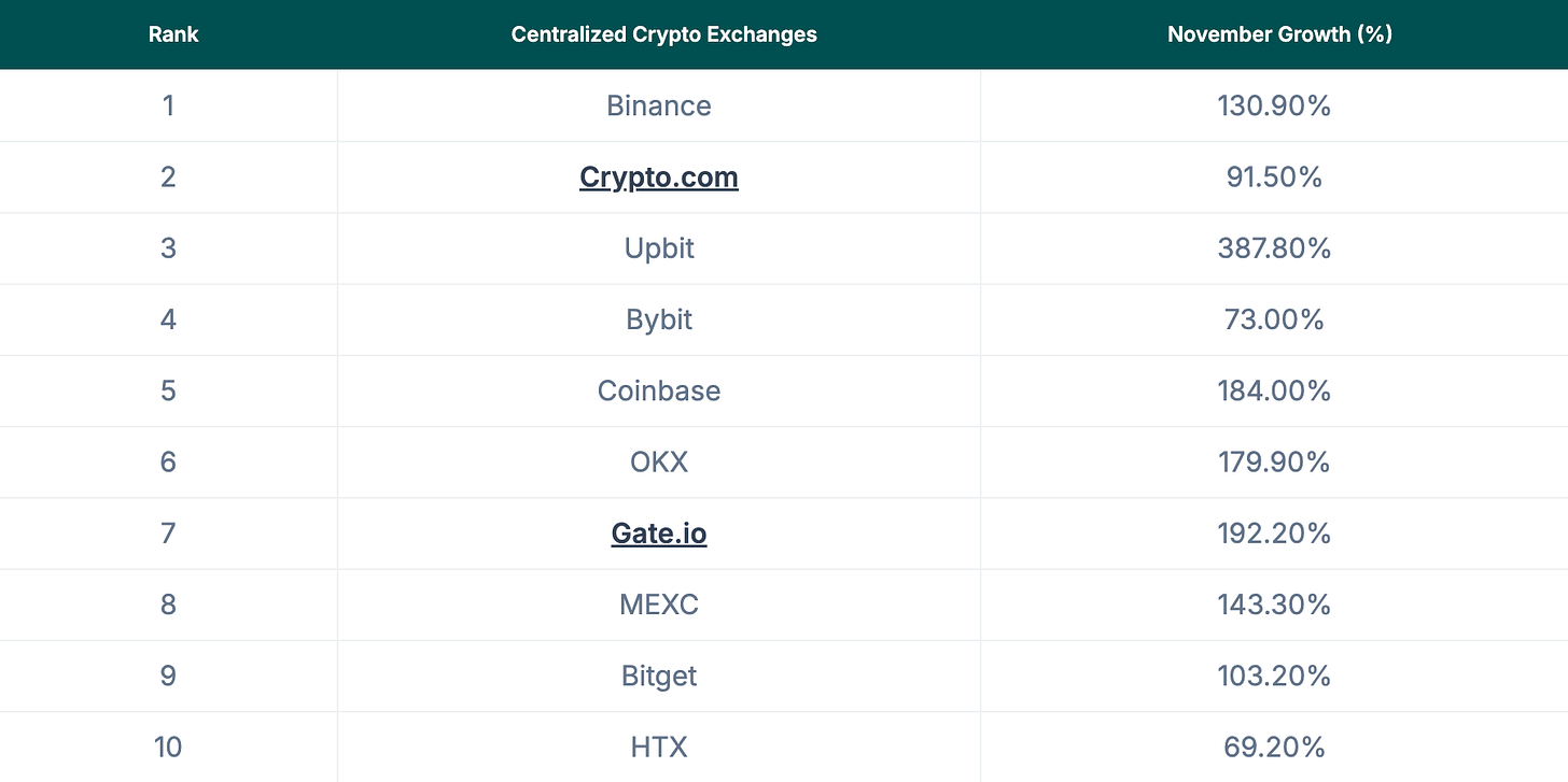 The top 10 exchanges showed remarkable growth in November 2024, with seven exchanges posting triple-digit growth percentages. This surge underscores the ongoing expansion and volatility in the crypto market.