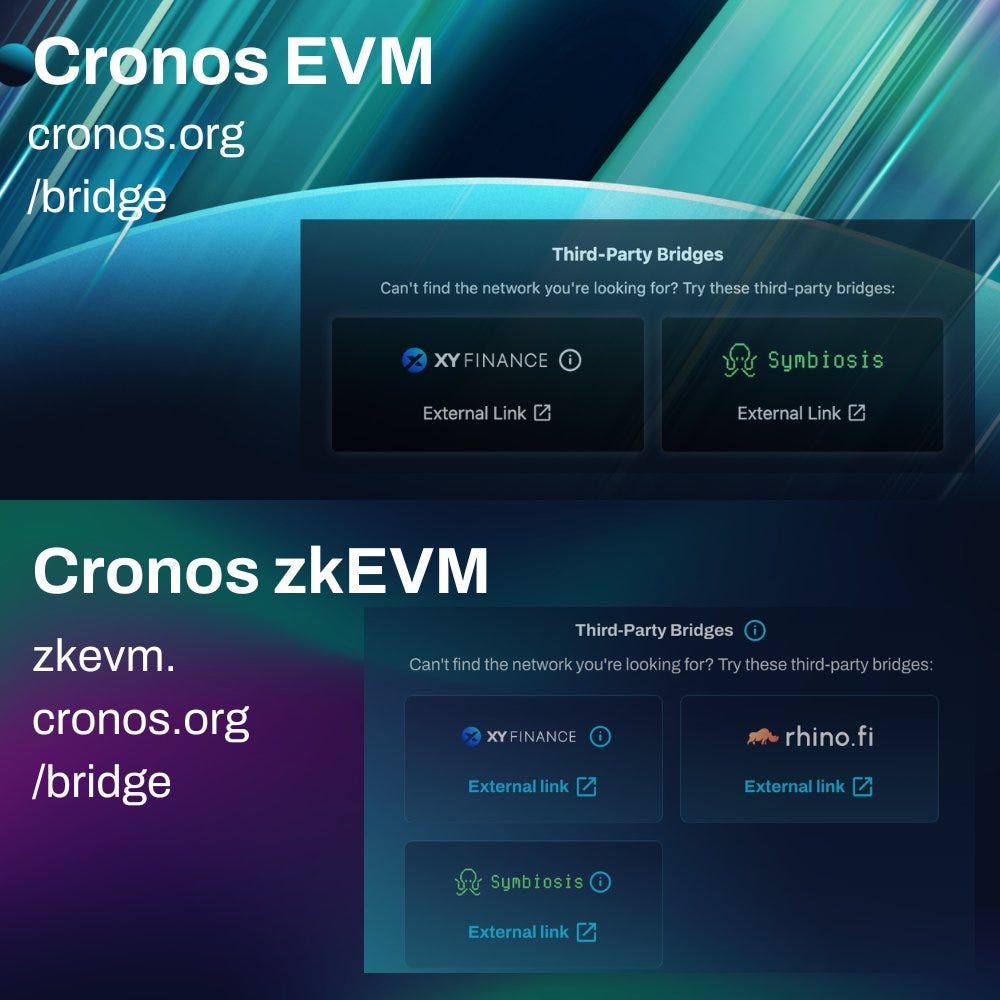 "Improving bridging options between Cronos EVM & zkEVM and other chains is a top priority for #Cronos users. To make bridging easier, the official bridge pages at https://cronos.org/bridge and https://zkevm.cronos.org/bridge now include links to 3rd party cross-chain apps. Happy trading!"