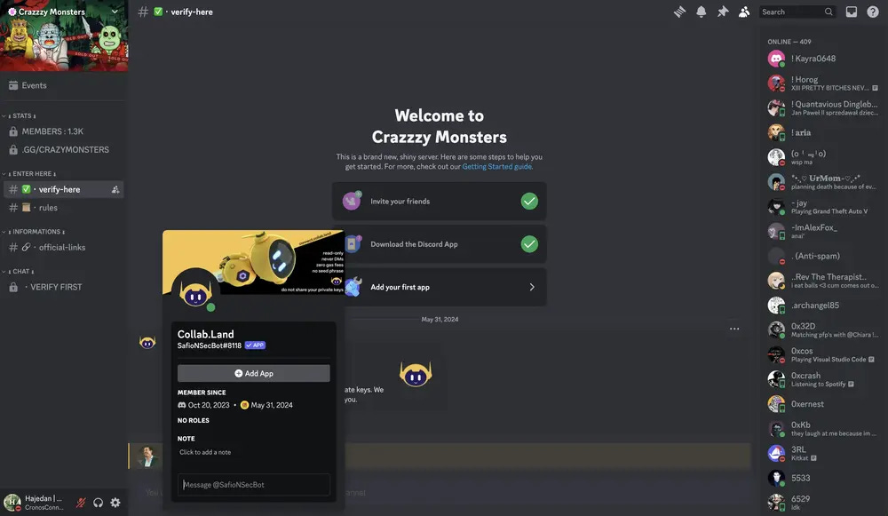 On May 31st, 2024, a mutual giveaway between GM Cronos and Crazzzy Monsters was targeted by bad actors. The attackers exploited shortened Discord invite links, leading users to fraudulent Discord servers equipped with a fake Collab Land bot designed to drain users' wallets through deceptive verification requests.
