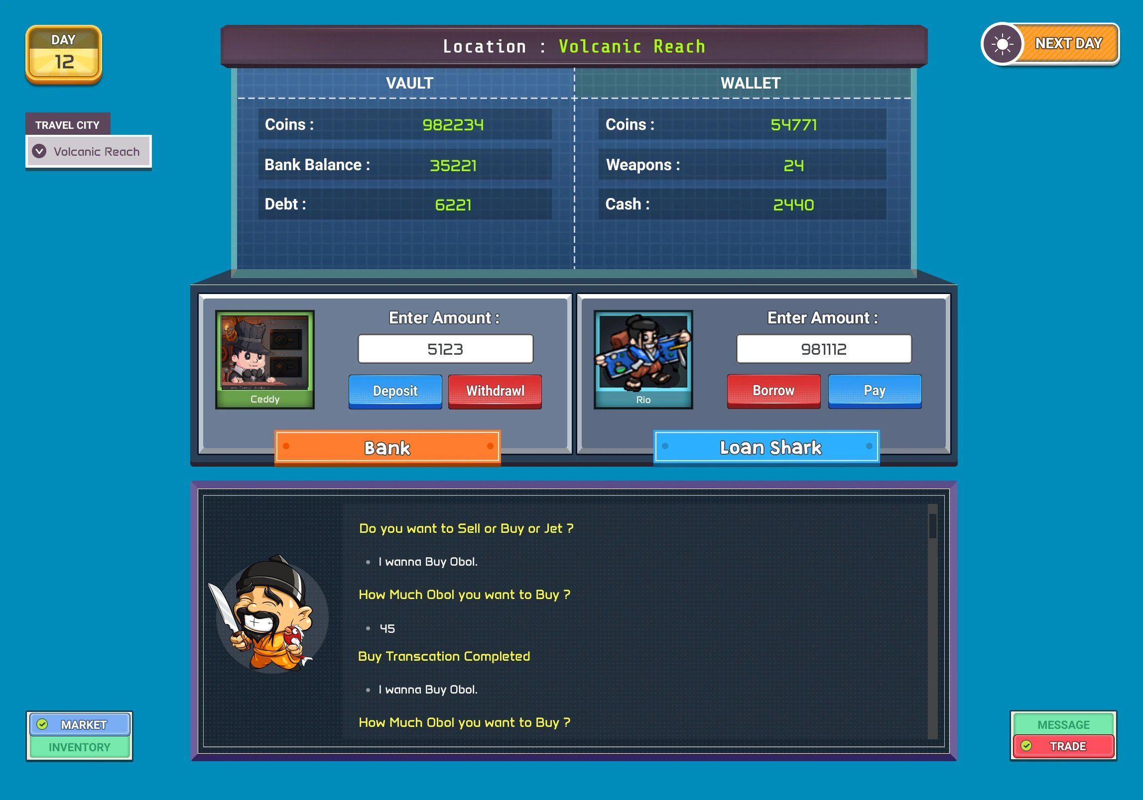 Travel Between Cities: Players navigate between cities with fluctuating coin prices influenced by local conditions and random events.