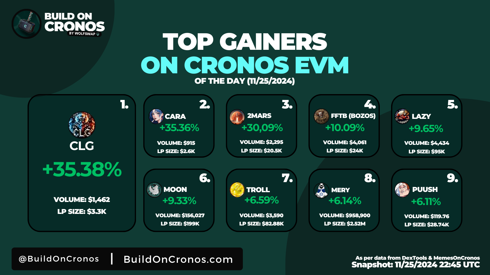 Data Source: DexTools & MemesOnCronos (Snapshot taken on November 25, 2024, 22:45 UTC)