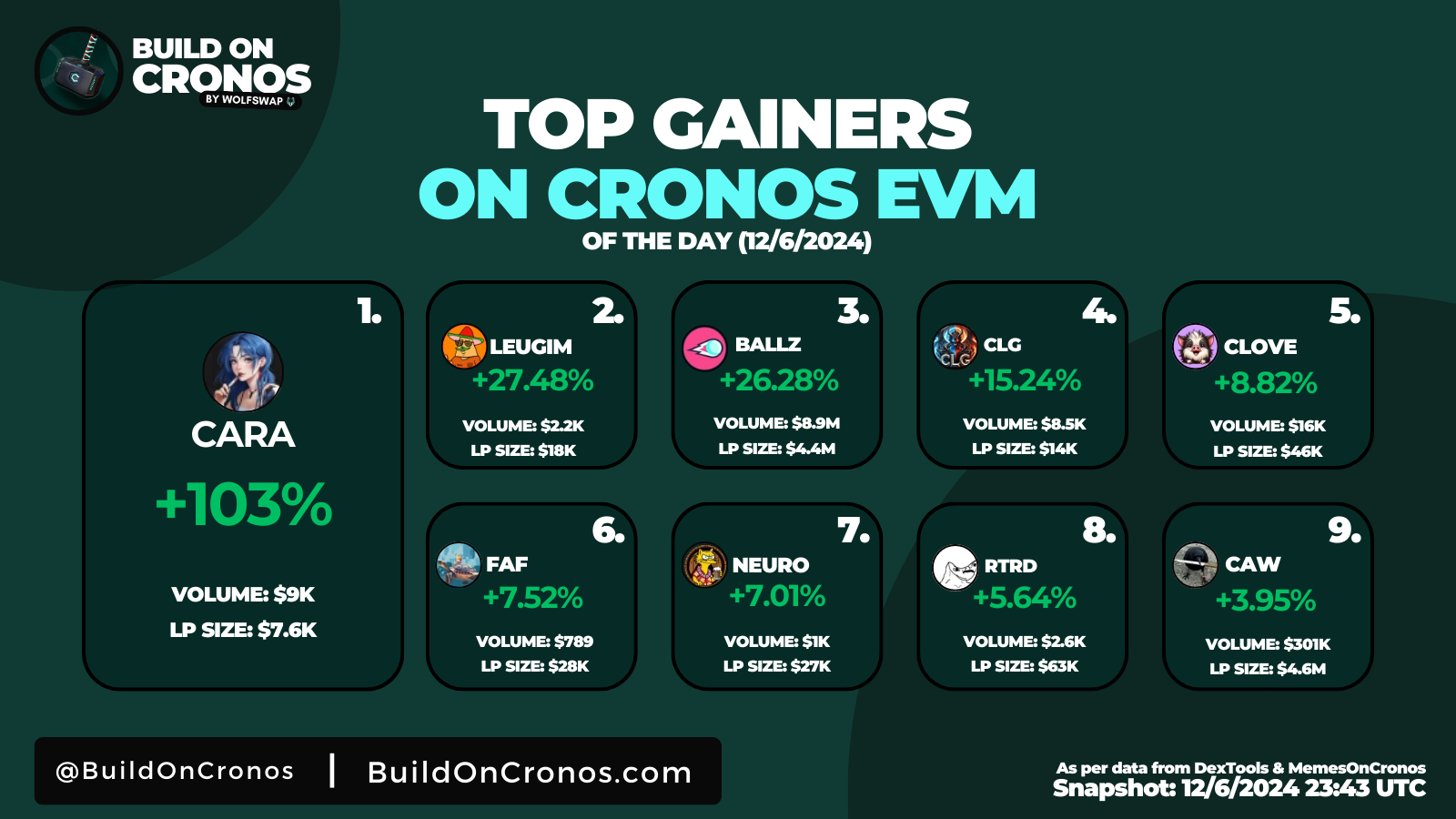 The Cronos ecosystem remains dynamic, with new tokens like CARA making significant strides, familiar names like CLOVE and CAW sustaining investor interest, and BALLZ bringing staggering volume. The market showcases opportunities for both new and experienced traders alike