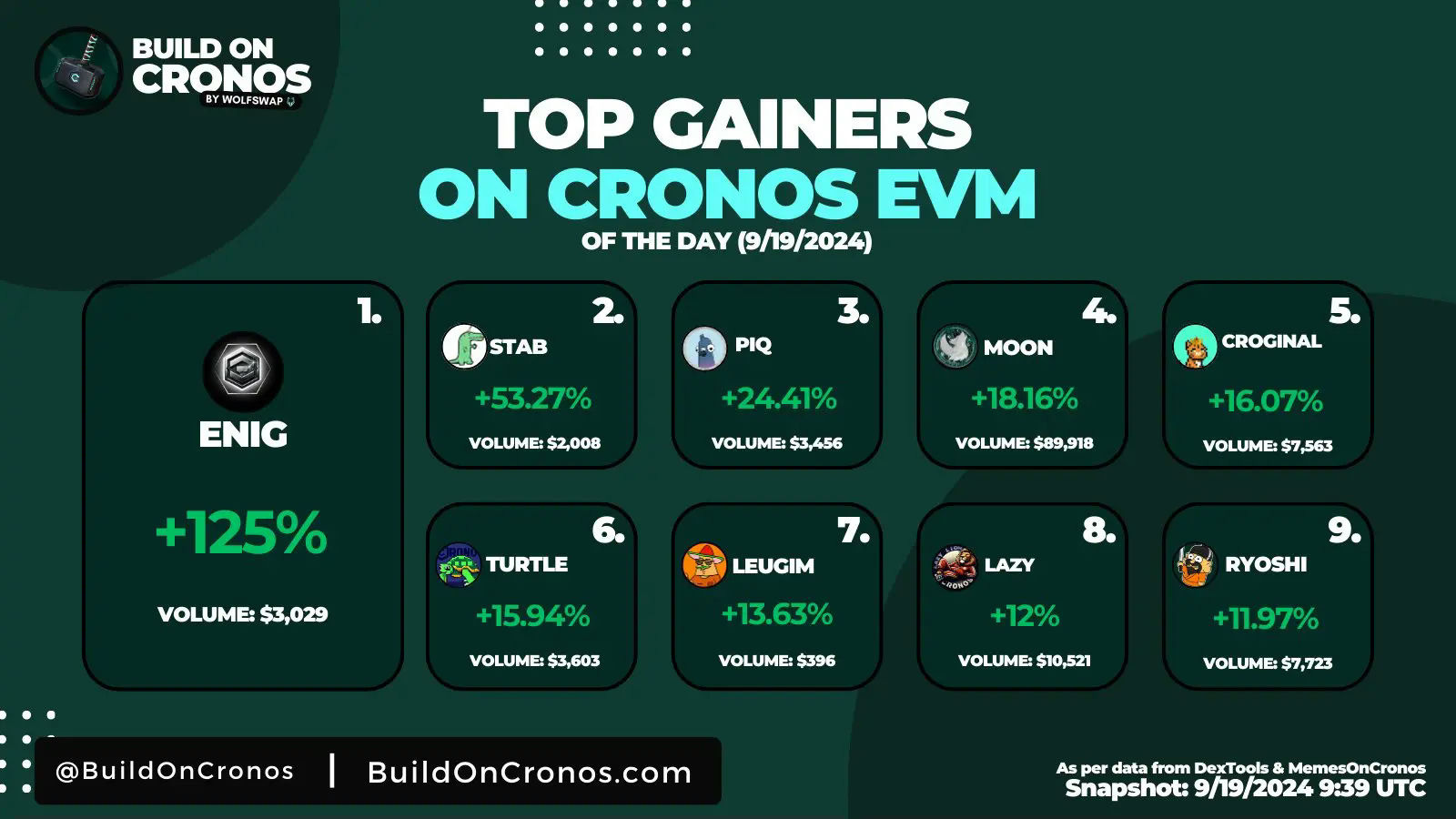 Snapshot taken from @DEXToolsApp and @memesoncronos on 9/19/2024 at 9:39 UTC.