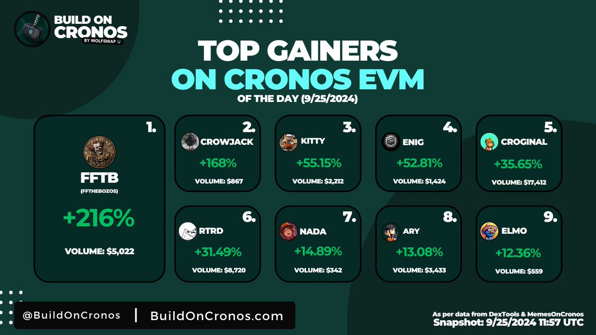 The Cronos EVM is EXPLODING with average gains of 66.60%. Here are the top gainers leading the charge: @FFTBcro, @CroWifJacket, @KittyCatCroMeow, @ENiGMA_cro, @Croginal, @TrueRTRD, $NADA, @CronosAry, and @ELMoCronos.