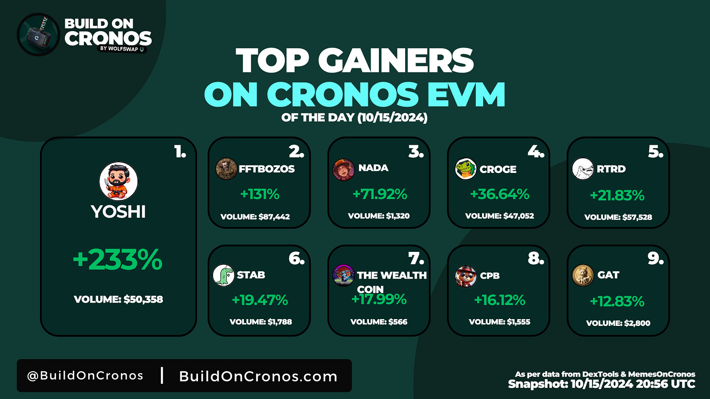 Top Gainers: @RyoshiBaby @FFTBcro $NADA @CrogeCoin @TrueRTRD @croc_with_knife @Thecryptophenom @CaponeBearGang @CatWifGat_CRO