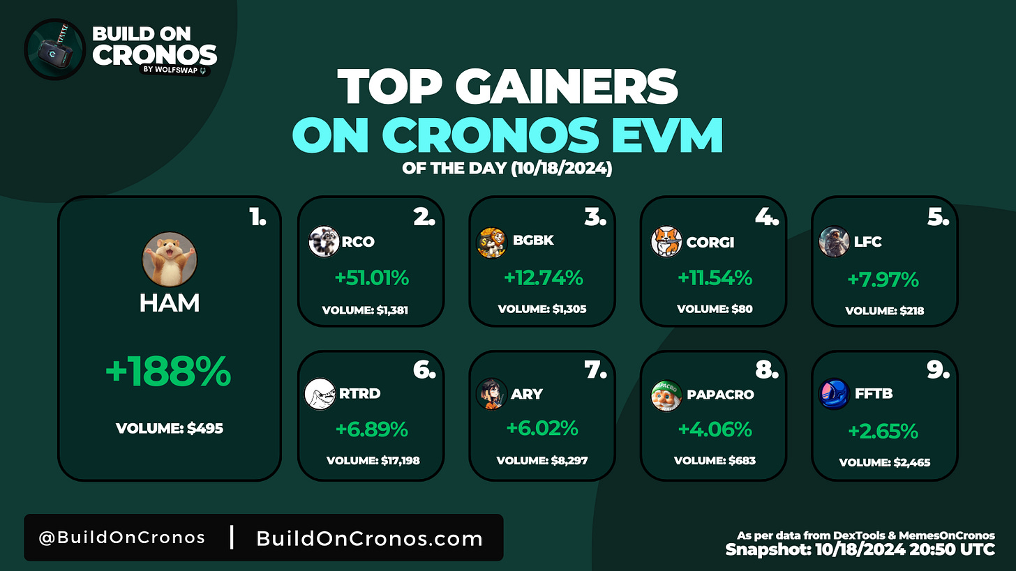 Top Gainers on Cronos EVM [10/18/2024]Low-caps making movesOct 18, 2024ShareTop Gainers:@dancinghamster_@RacCROon_@BgBk_Official@corgiwithknife@LetsCro_Token@TrueRTRD@CronosAry@PAPACRO_@FFTB_Cronos Snapshot per @memesoncronosPreviousNext