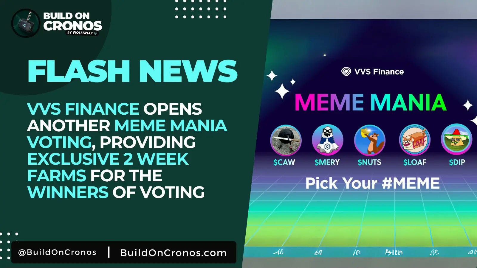 @VVS_finance has opened a new round of voting for Meme Mania, offering exclusive two-week farms for the winning tokens. Cast your vote for $CAW, $MERY, $NUTS, $LOAF, or $DIP between September 19th, 9 AM UTC, and September 21st, 9 AM UTC at the VVS Discord: Vote Here.